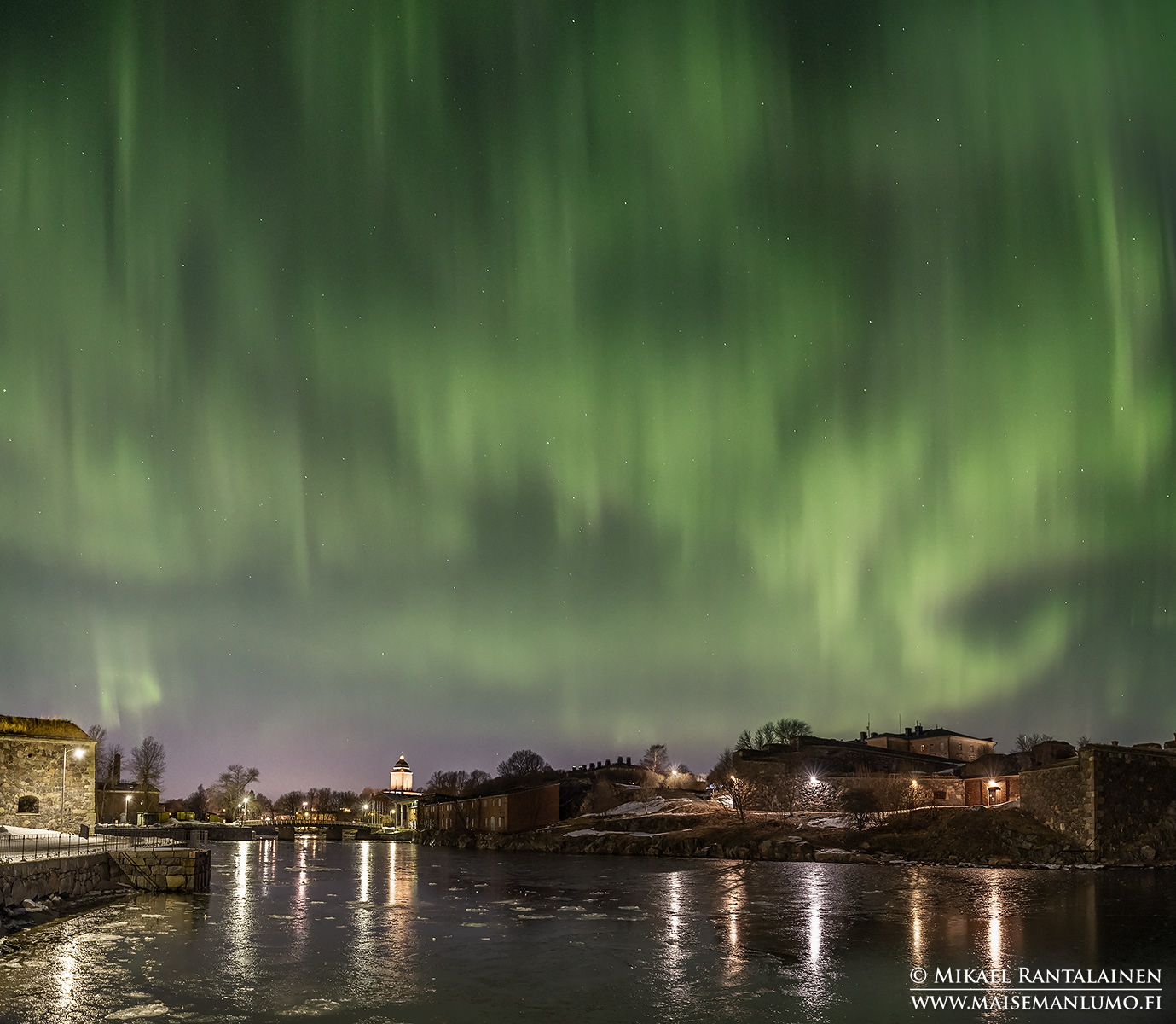 Sen vuoksi itse lähden pääkaupunkiseudulla mieluummin kuvaamaan revontulia Suomenlinnaan, kuin Helsingin ulkopuolelle, peltoaukiolle tai metsän keskelle, missä kuvassa ei olisi mitään tunnistettavaa. Tosin täytyy myöntää että kuvaus ei läheskään aina onnistu Suomenlinnassa valosaasteen vuoksi… Eli revontulet näkyvät sitä paremmin mitä vähemmän on valosaastetta. Valosaasteesta eroon pääseminen vaatii yleensä isosta kaupungista lähtemistä useiden kymmenien kilometrien päähän. Suomenlinnassa näkyivät siis vain voimakkaat revontulet, mutta jos siellä onnistuu, niin ainakin itse olen erittäin tyytyväinen 🙂
