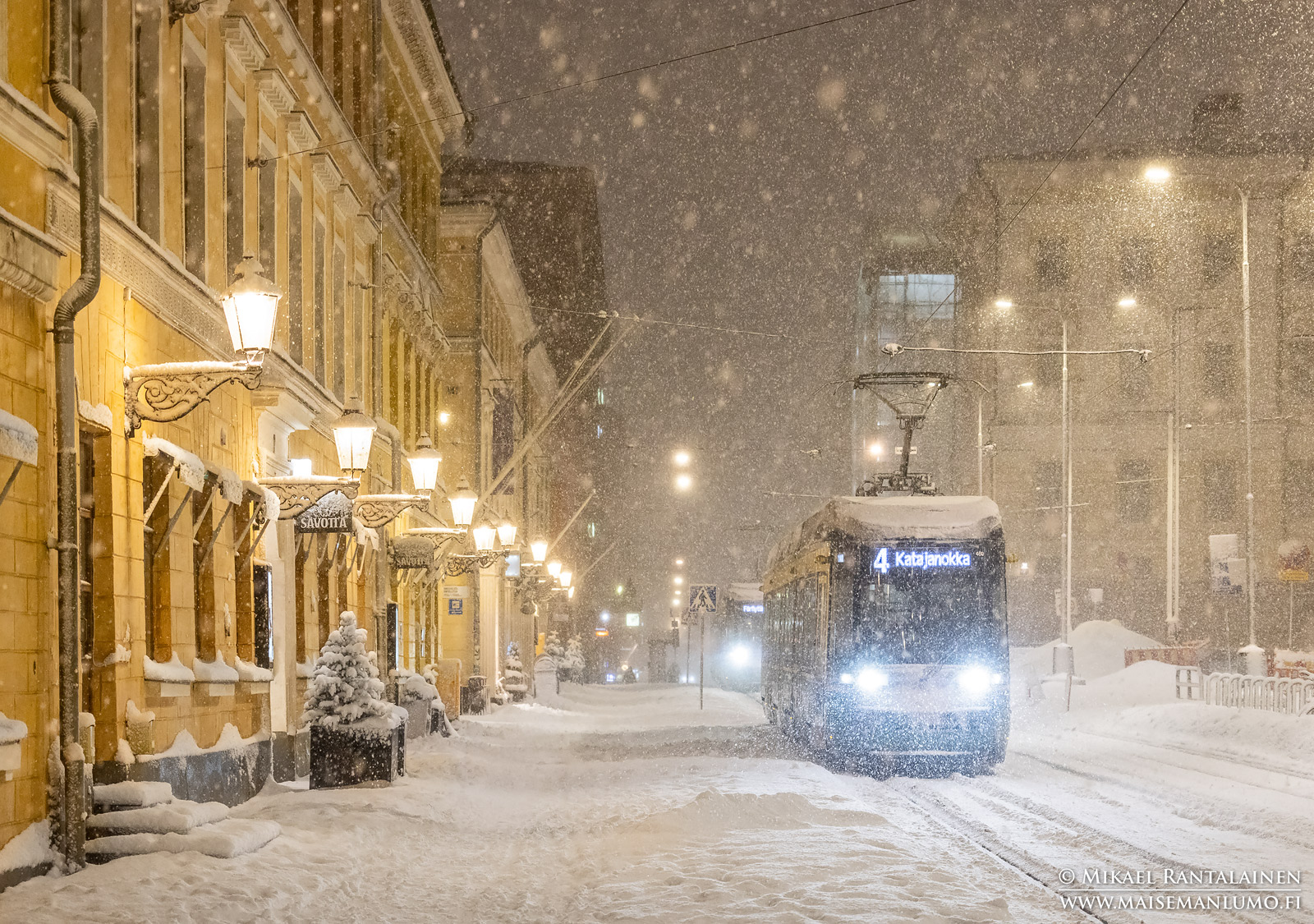 Sakea lumisade on mielestäni yksi talven kuvauksellisimmista ilmiöistä. Lumi piilottaa ”häiritseviä elementtejä” ja yksinkertaistaa maisemaa. Lumisade myös korostaa syvyysvaikutelmaa, kun kaukaisimpien kohteiden kontrasti on matalampi. Lumisadetta voi kuvata ihan lyhyellä valotusajalla (esim. 1/200 – 1/500 sekuntia) joka pysäyttää (lähes) täysin lumihiutaleet. Jotta tämä näyttäisi hyvällä, lumihiutaleiden pitäisi olla isoja, jotta ne ovat näyttäviä kuvassa. Joten yleensä kuvaa lumisadetta hieman pidemmällä valotusajalla: 1/10-1/40 sekuntia. Tällöin hiutaleet ehtii liikkumaan hieman, eli hiutaleet ehtii piirtämään pientä viivaa. Ja lumisade näyttää sakeammalle. Paras suljinaika riippuu siitä kuinka nopeasti lumihiutaleet liikkuu, kannattaa kokeille eri suljinaikoja (liian pitkä suljinaika saa hiutaleet katoamaan kuvasta). Mutta salaisuus siihen että lumisade näkyy kuvassa hyvin on se että tausta on tummempaa! Tämän voi saavuttaa siten että taustalla näkyy esim. avovettä, tumma rakennus, tumma yötaivas tai vaikka tumma ratikka. Tämän artikkelin alkukuvana olevassa Myllykosken suvannolla otetussa kuvassa kameran asetukset olivat: 20 mm, f/13, ISO 100 ja 1/30 sekuntia. Huomaa että lumisade näkyy hyvin vain tummaa vettä vasten.