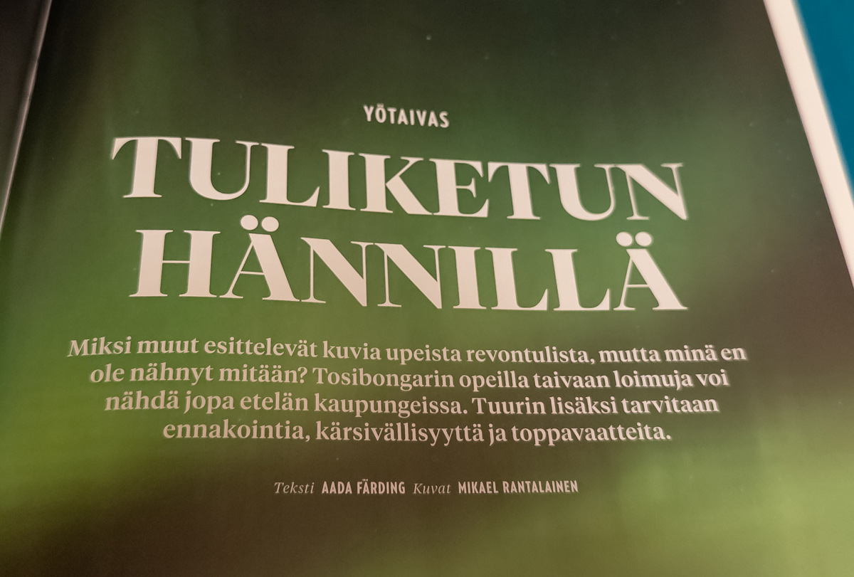 Anna jutussa vinkkejä revontulien ennakoimiseen ja kuvaamiseen. Joten jos sinua kiinnostaa lukea artikkeli, niin osta lehti lehtipisteesta tai tilaa digi-lehti! Ja jos haluat lisäohjeita revontulien kuvaamiseen, niin lue kotisivuiltani vinkkini revontulien kuvaamiseen tai tule ensi syksynä Yövalokuvauskurssille opiskelemaan revontulien kuvausta käytännössä.